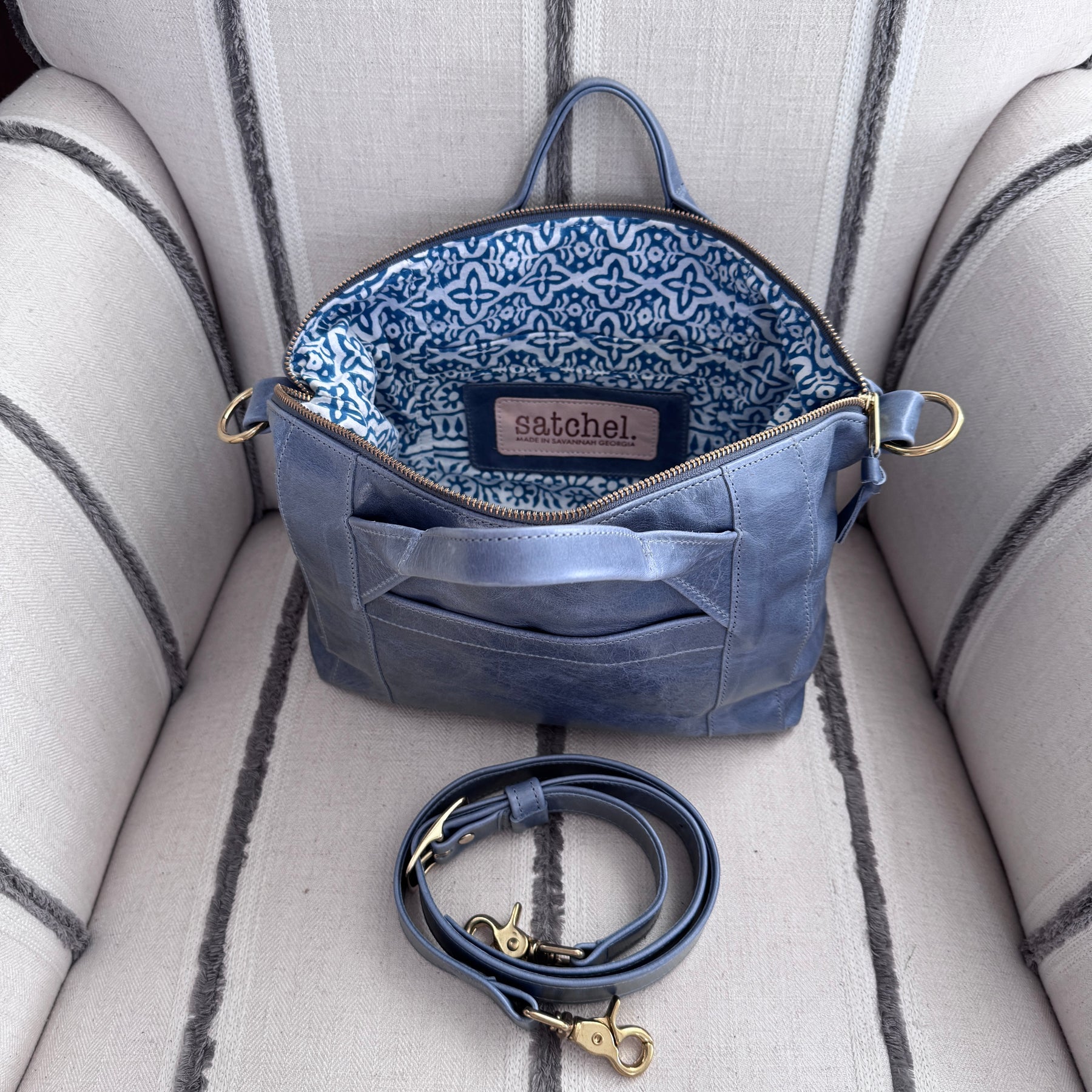 I purchased the Boho Jill in blue metallic leather via text message with the store. The bag is beautiful! I appreciate the two outside pockets for easy accessibilty. It also has two interior pockets for your keys or smaller item. The interior is very roomy and a magnetic snap keeps it shut. This is my fourth Satchel bag. I appreciate handmade, quality work over big name labels.