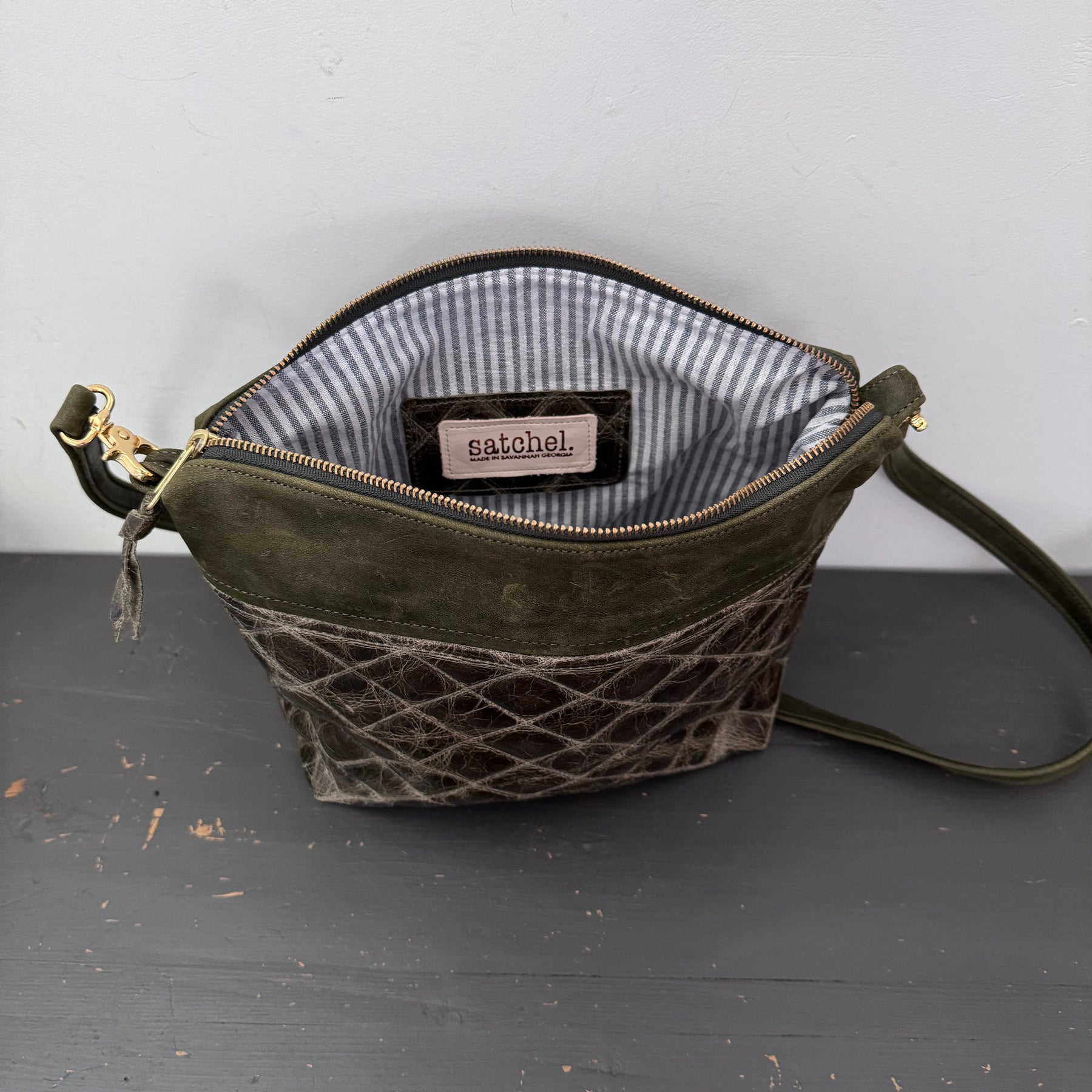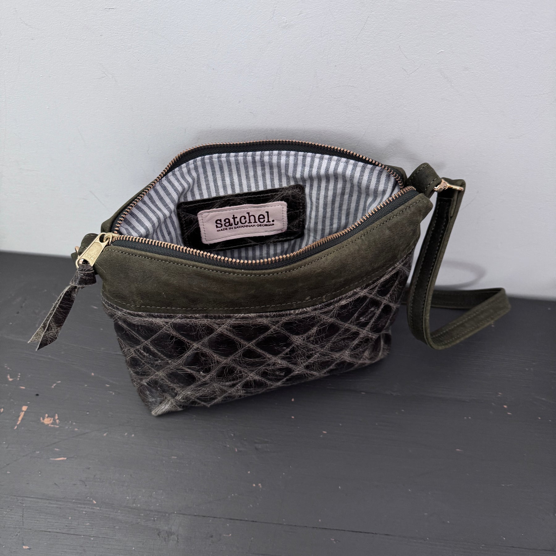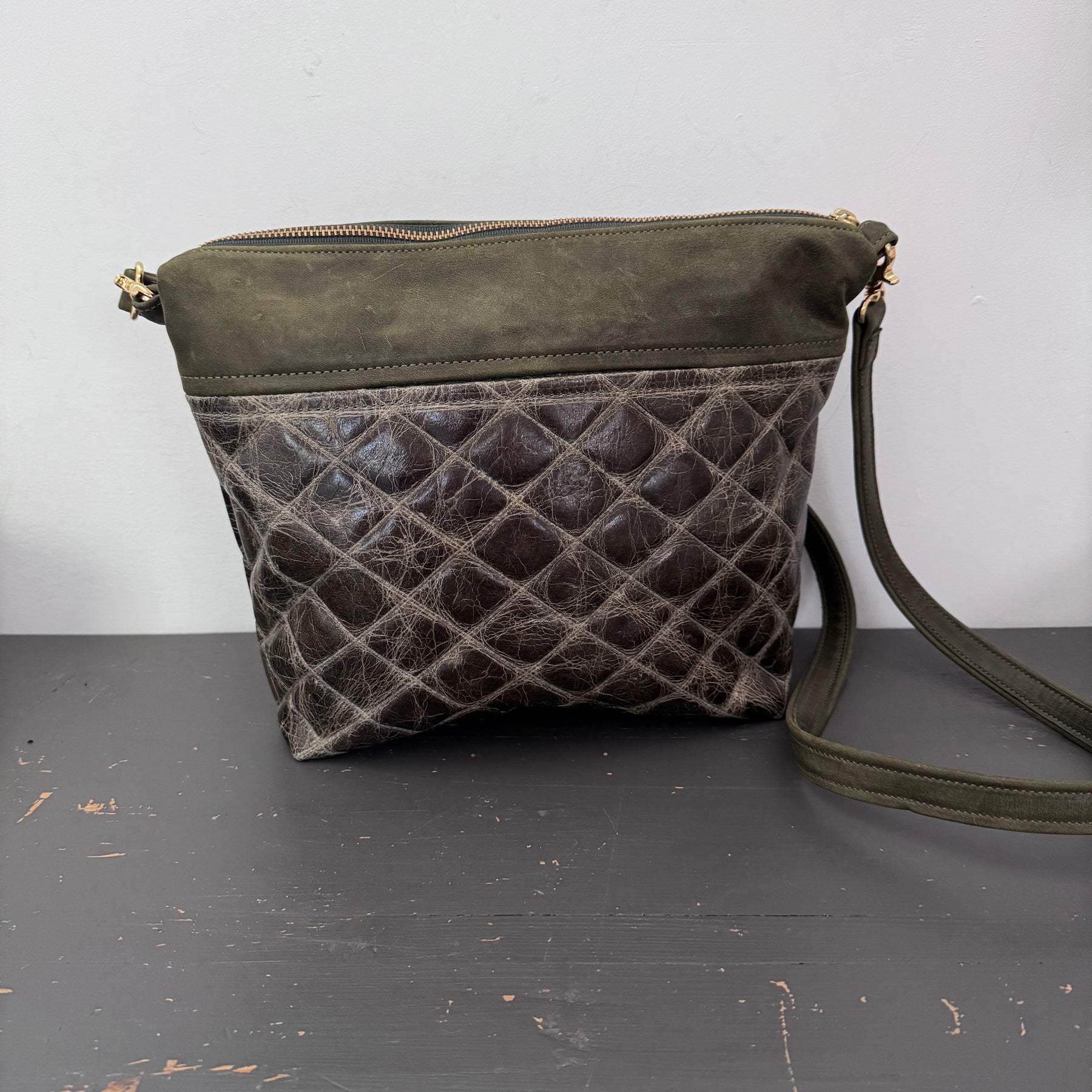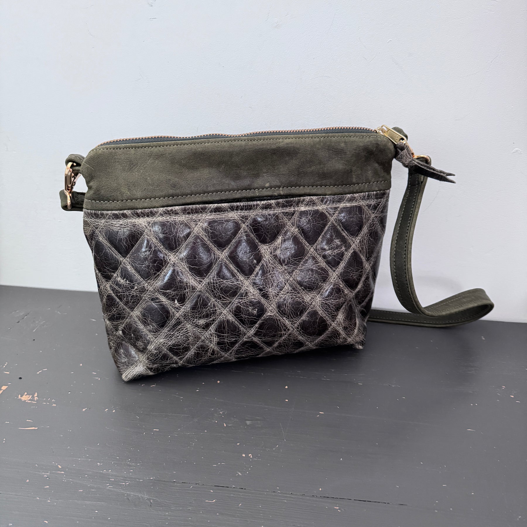 Has a slip pocket on the outside and one pocket on the inside. Comes with an adjustable messenger strap.