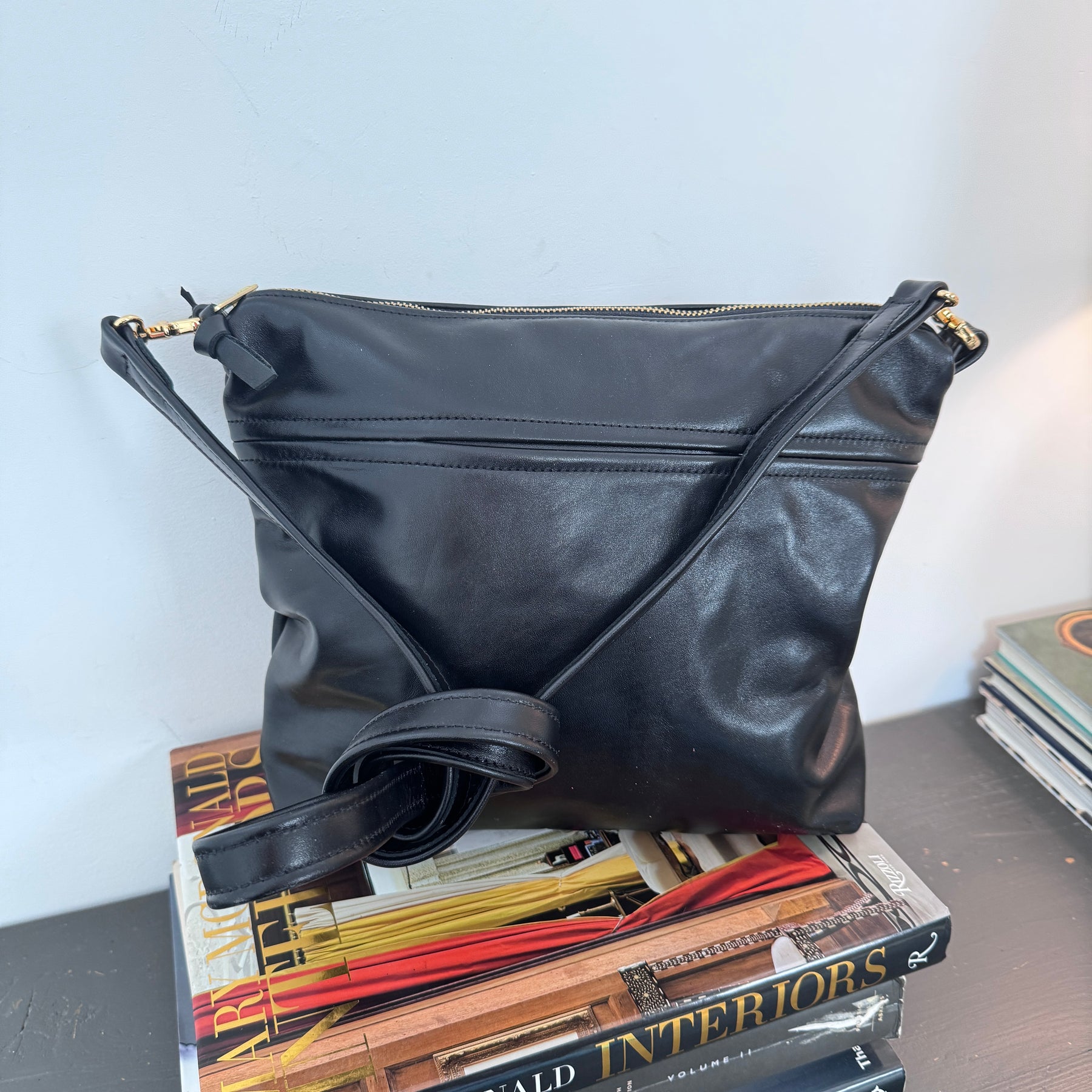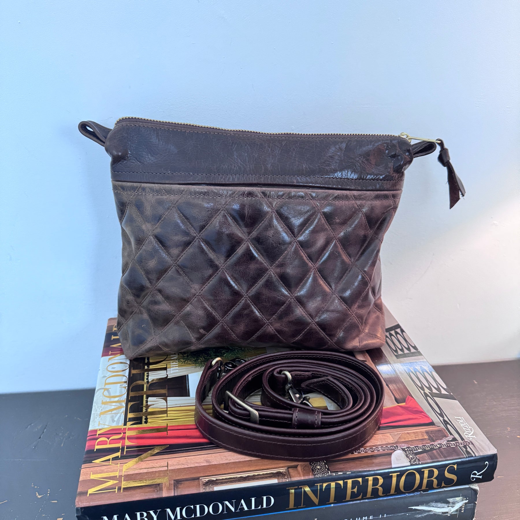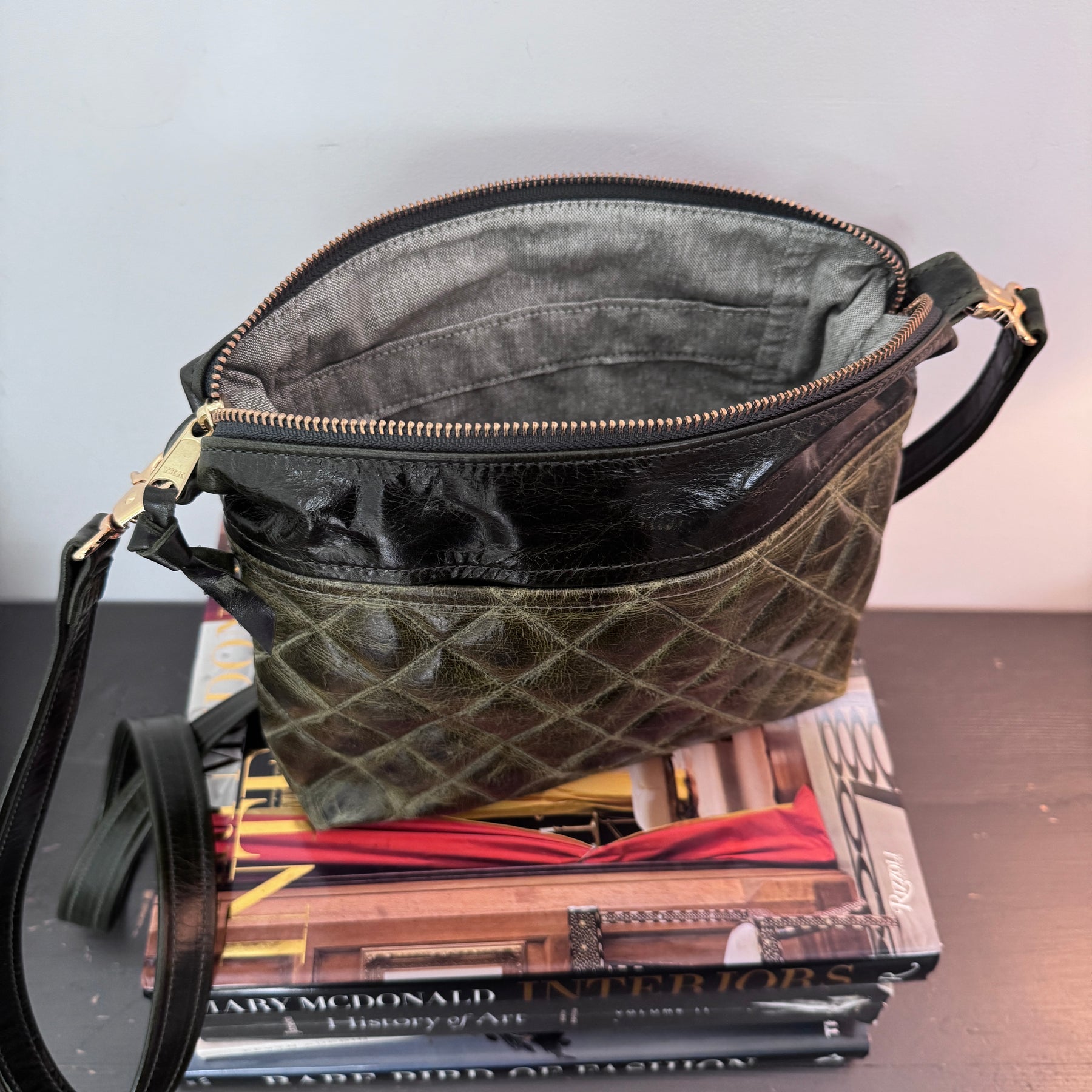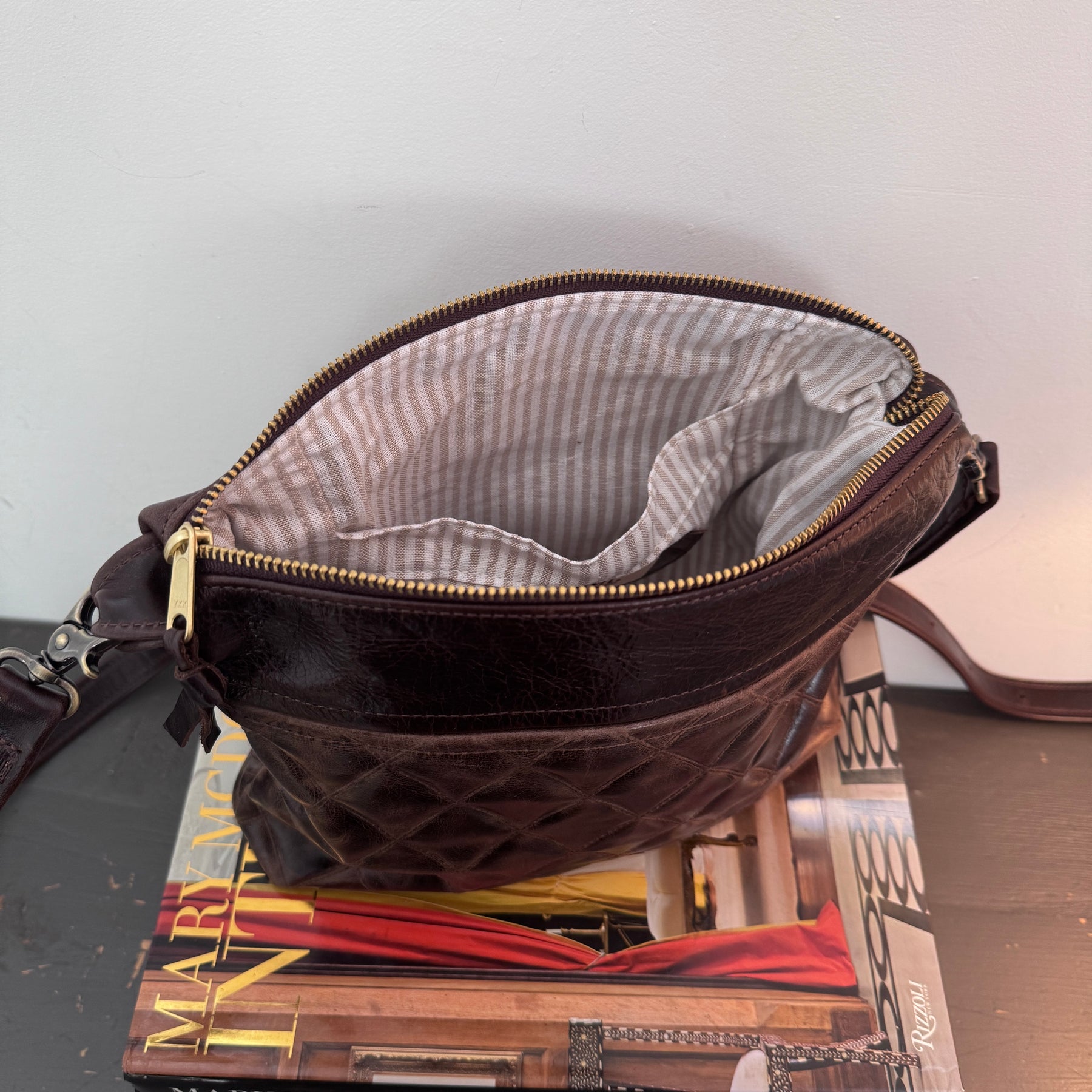 Has a slip pocket on the outside and one pocket on the inside. Comes with an adjustable messenger strap.
