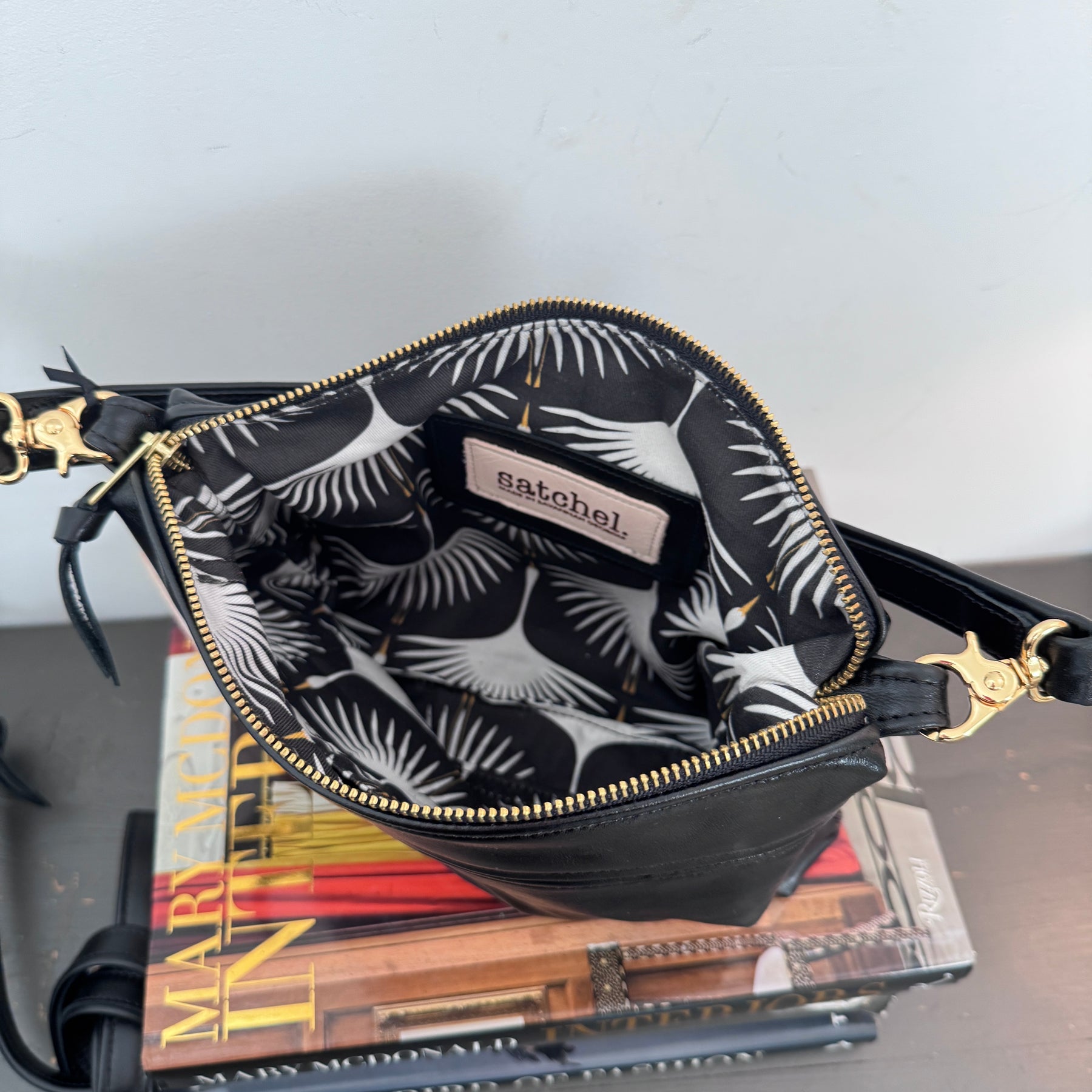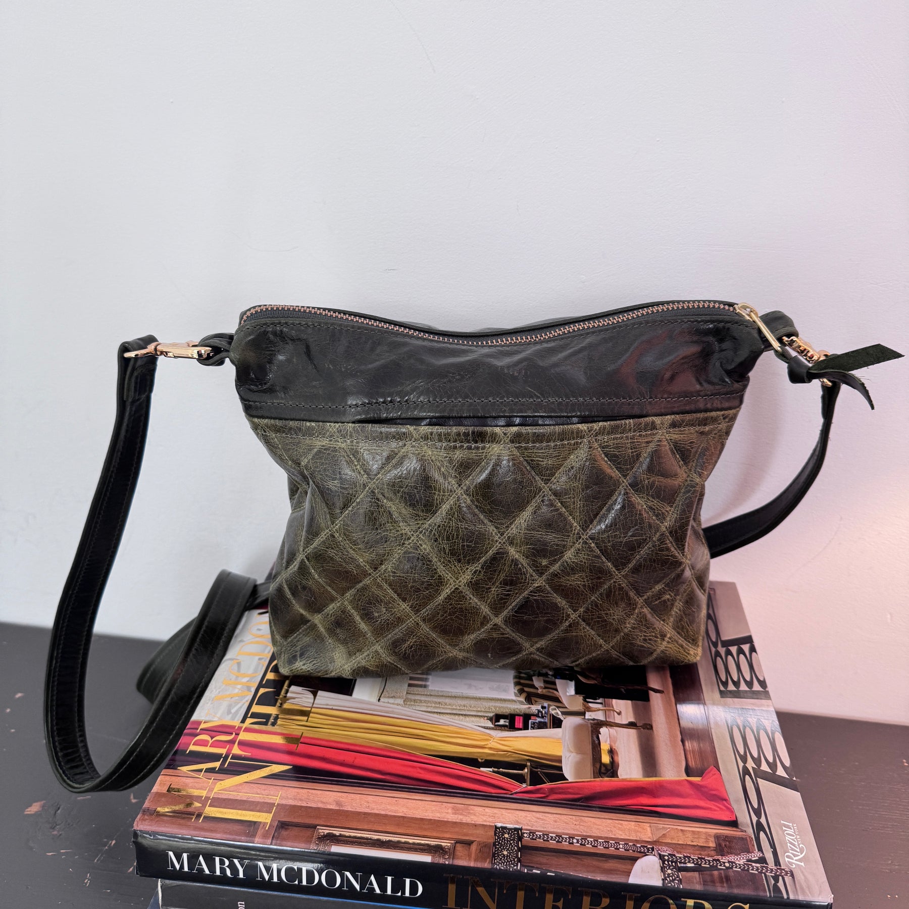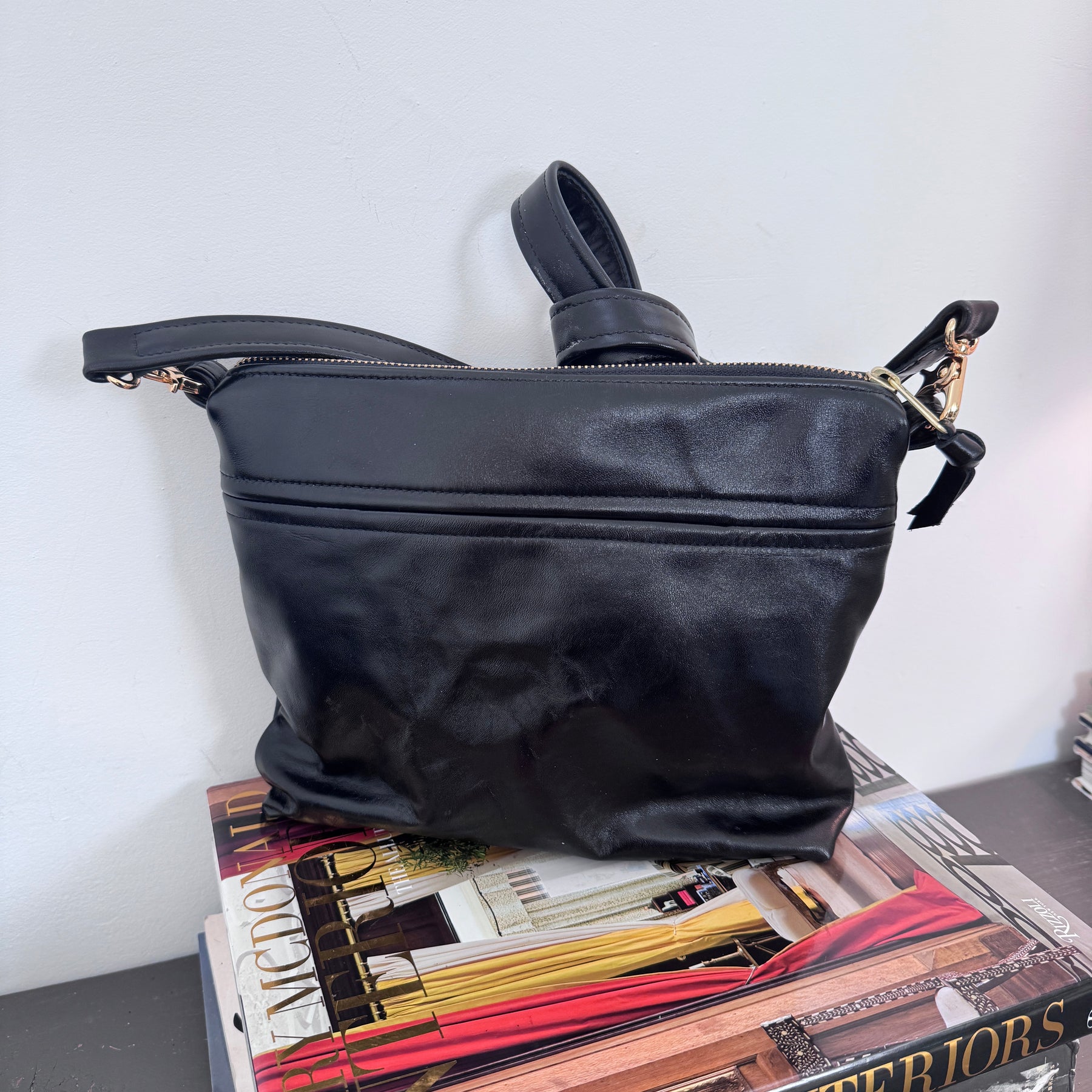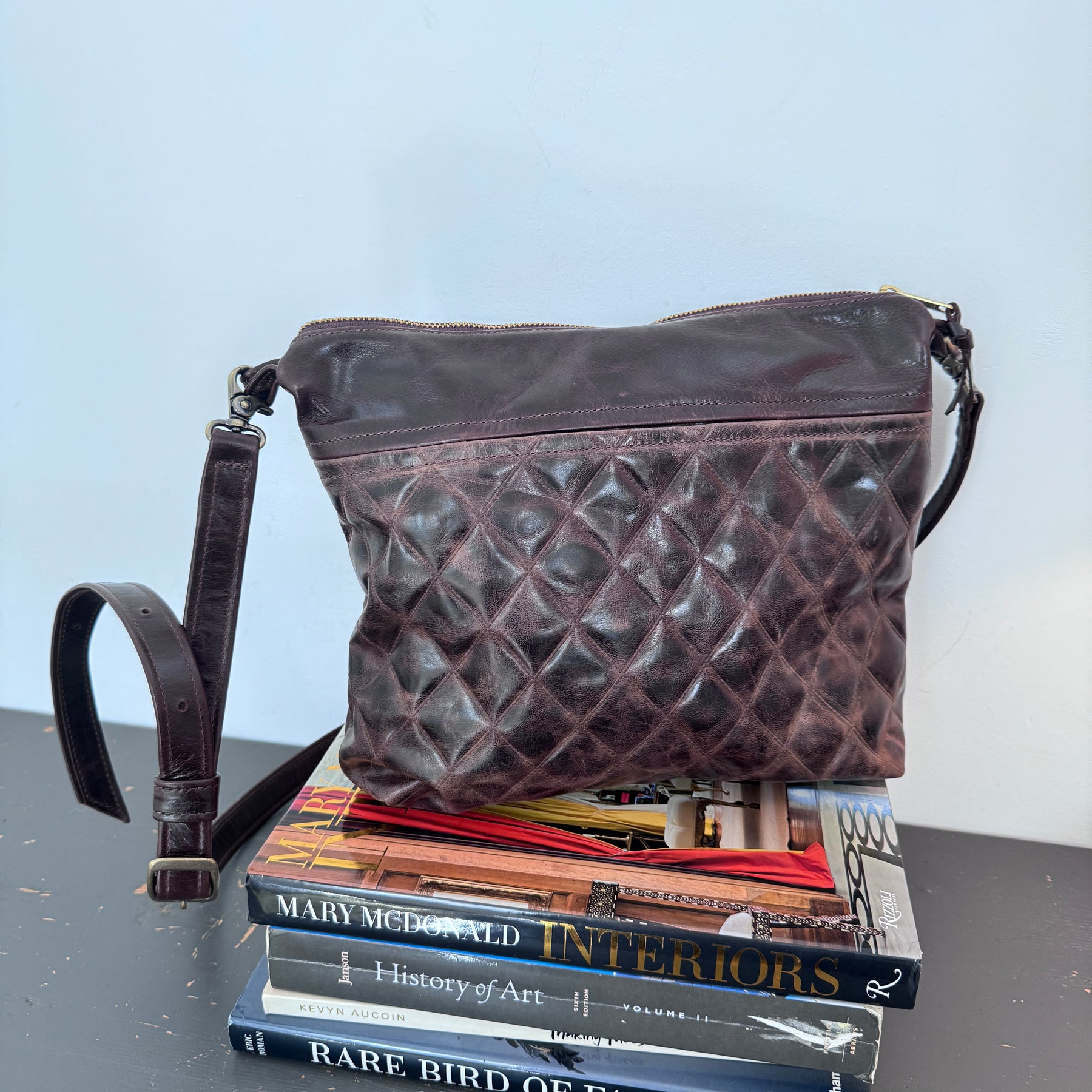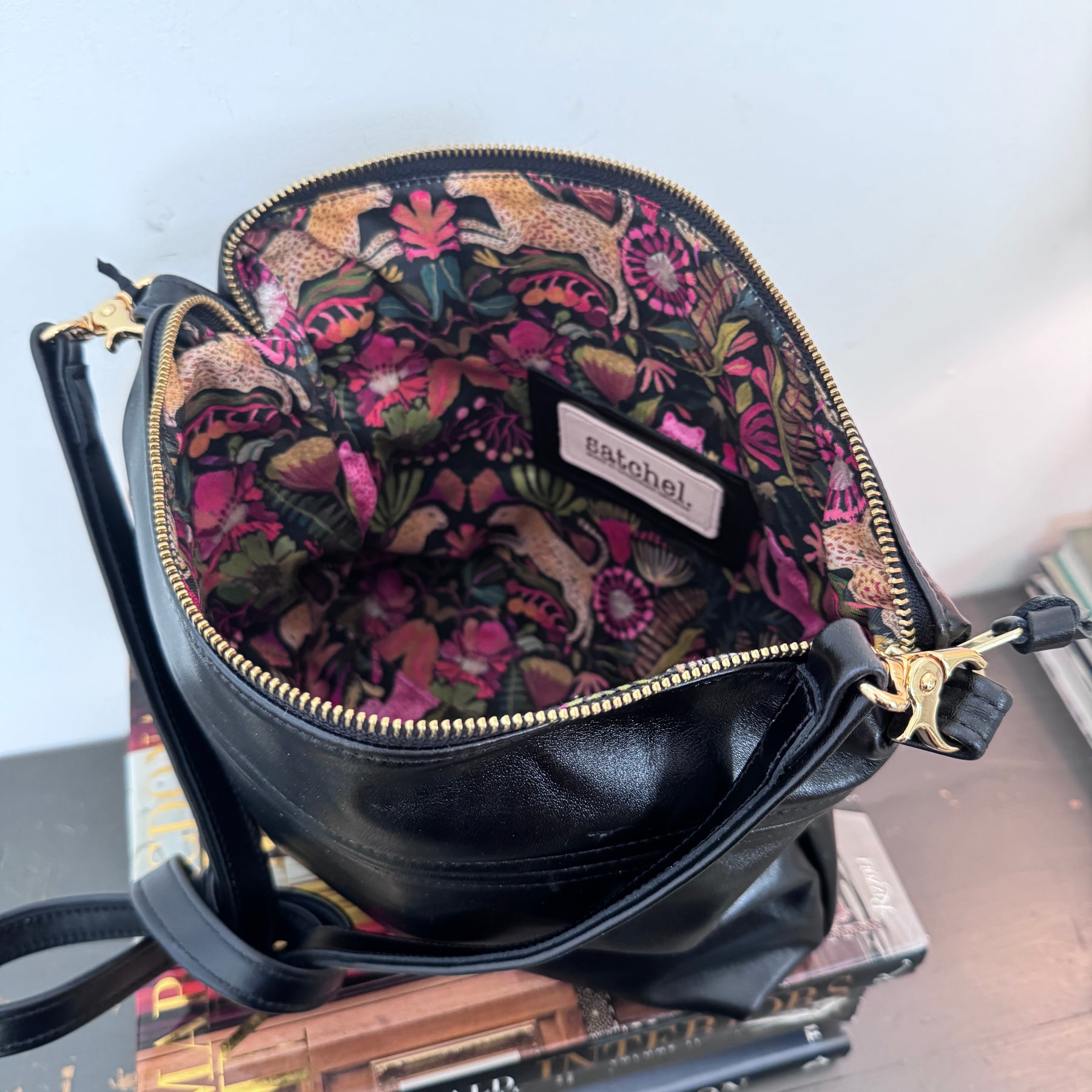 Has a slip pocket on the outside and one pocket on the inside. Comes with an adjustable messenger strap.